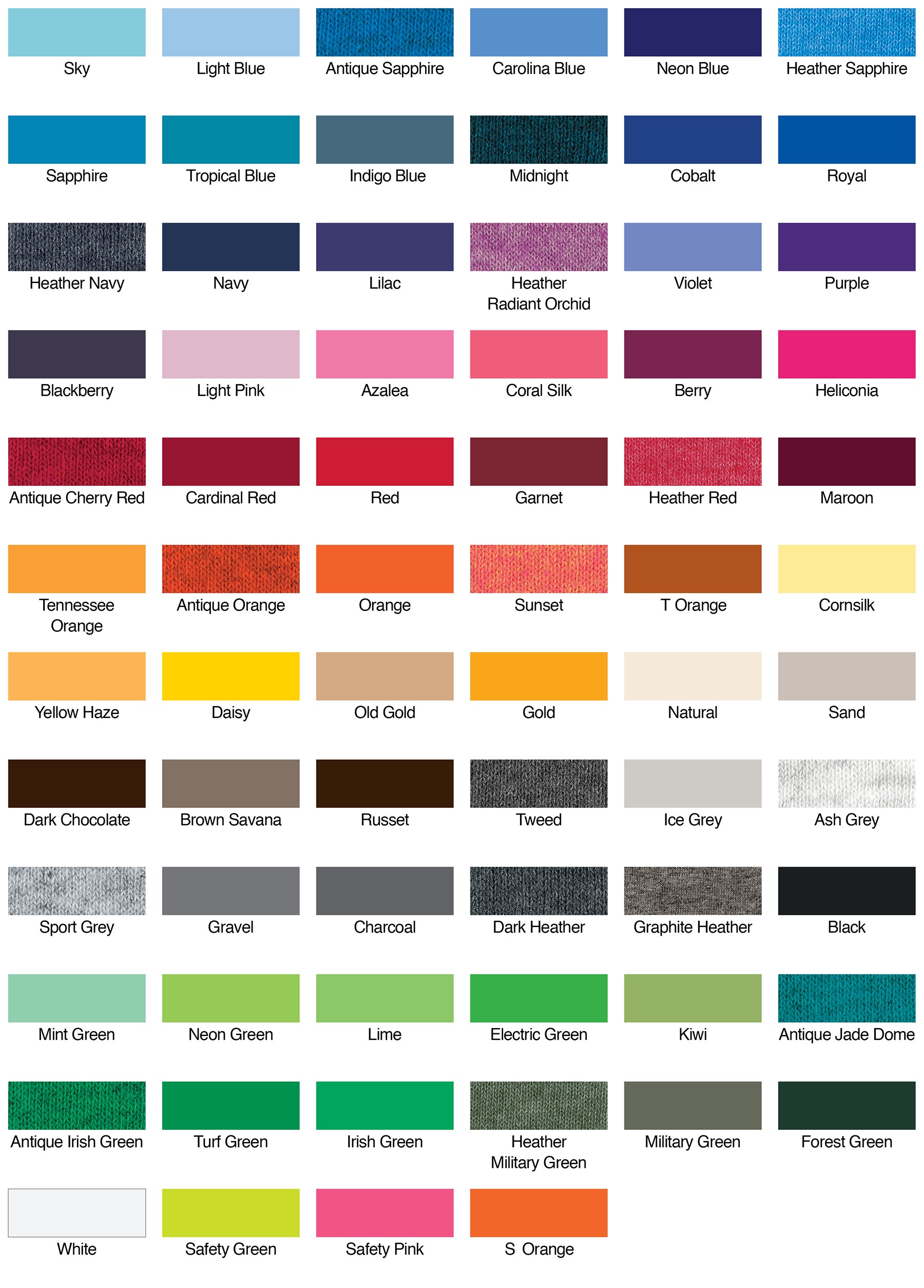 - 50/50: Blackberry, Dark Heather, Graphite Heather, Heather Military Green, Heather Navy, Heather Radiant Orchid, Heather Red, Heather Sapphire, Lilac, Midnight, Neon Blue, Neon Green, Russet, S Orange, S Green, Safety Pink, Sunset, Tweed